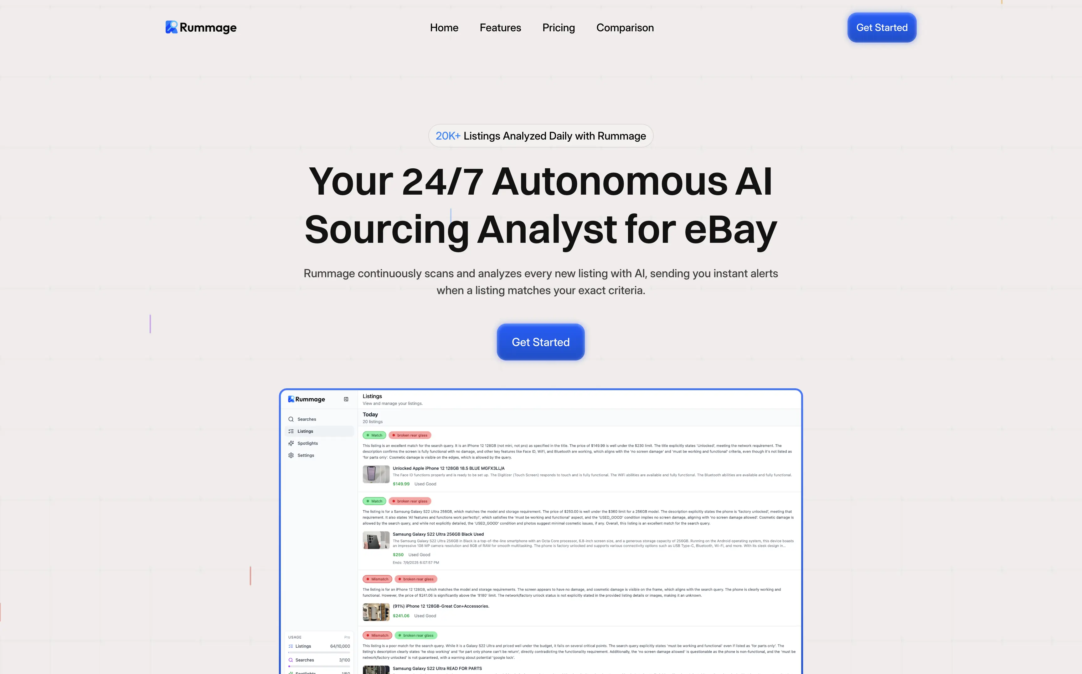 Rummage AI · June 2025Rummage continuously scans and analyzes every new eBay listing with AI, sending you instant alerts when a listing matches your exact criteria.